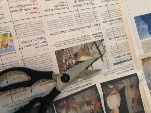 Comece separando folhas de jornais que não tenham notícias ruins, use os classificados ou a parte de artes, que sempre cai bem. Em seguida abra as folhas ao meio e recorte. Use duas ou 3 folhas por saquinho.